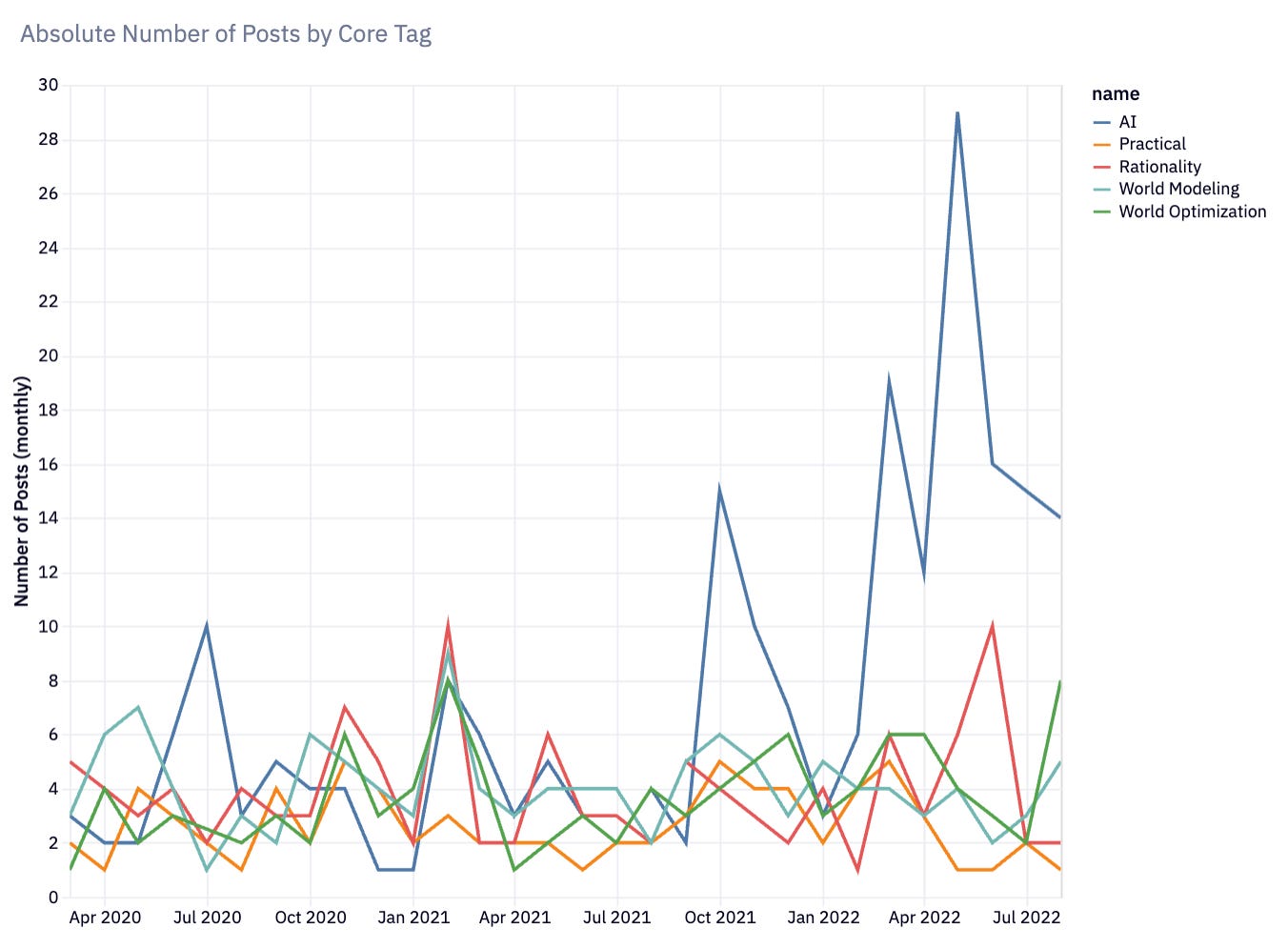 Since April 2022, AI-related content has dominated the LW forum - going from ~25% in 2021 to close to almost 50%. This is driven by more AI posts, other topics stayed constant. See graph (AI tagged posts is the blue line):